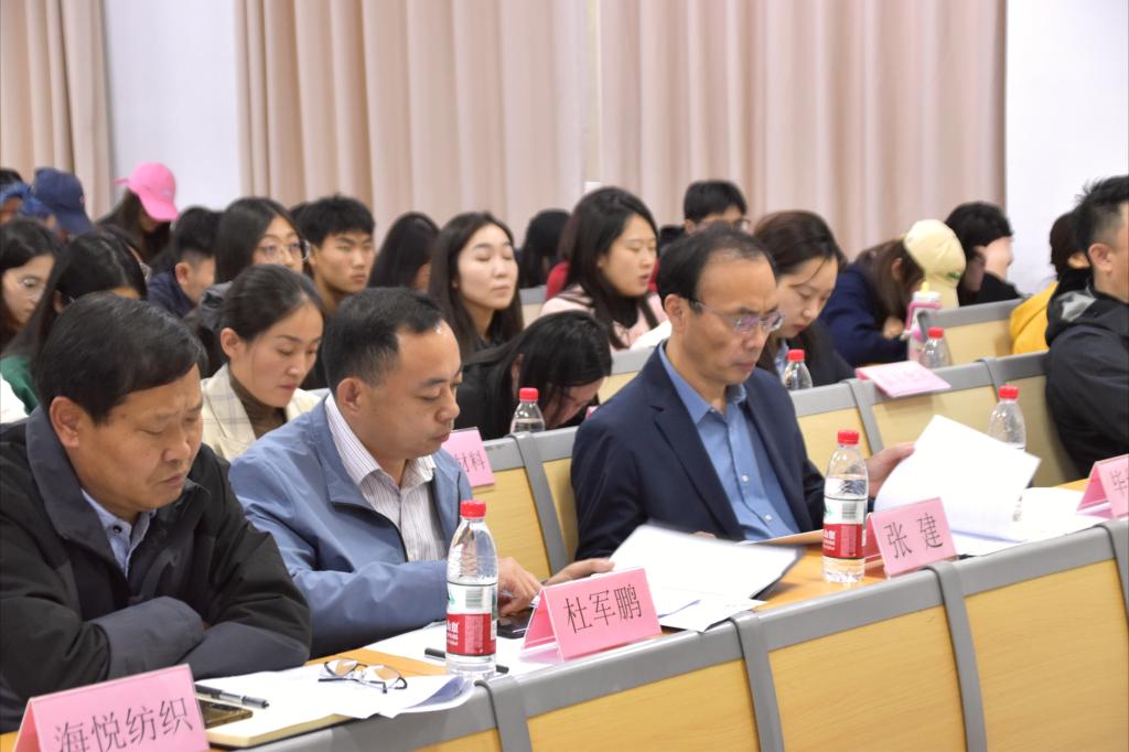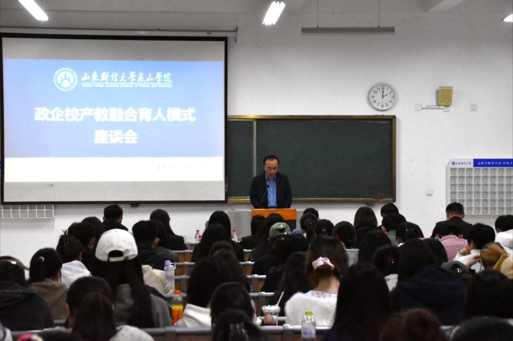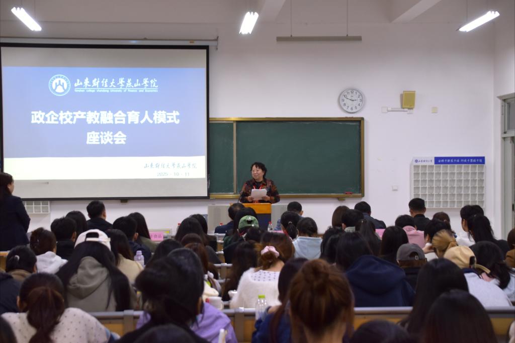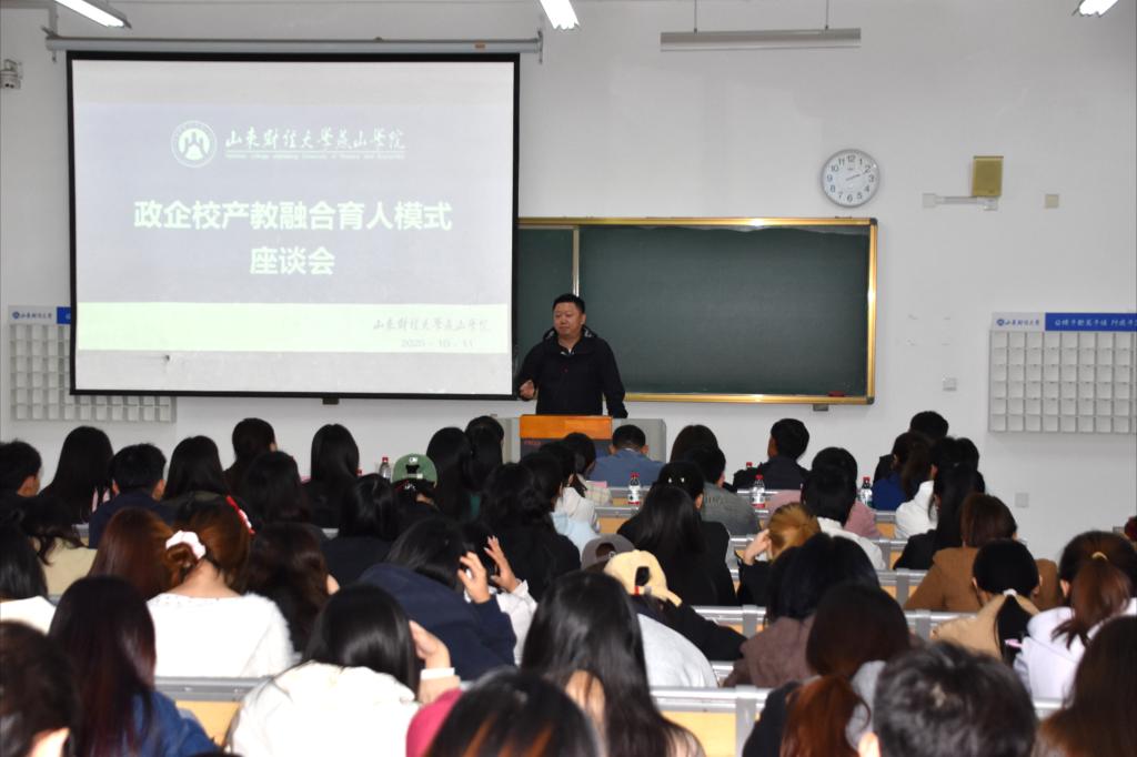 10 月 11 日 ,为纪念山东财经大学燕山学院高质量办学二十周年,国际商学院在 6105 教室举办政企校产教融合育人模式座谈会。莱芜高新区经济发展部副部长杜军鹏、莱芜本地 7 家企业代表受邀出席,燕山学院党委书记张建参会,会议由国际商学院院长毕红毅主持,近百名国际商学院学生代表到场聆听,会场座无虚席。